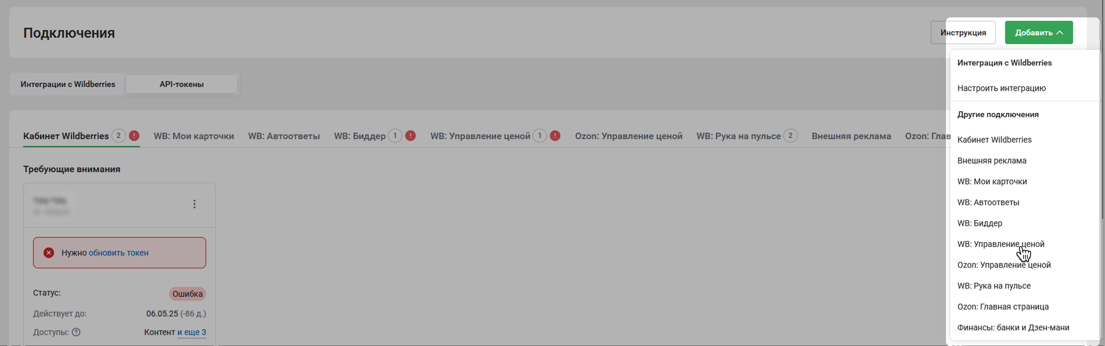В разделе Подключений можно проверить статусы всех добавленных подключений. Там же их можно редактировать и удалять. Если токен не загрузился, система выдаст ошибку и предложит сгенерировать и обновить токен.