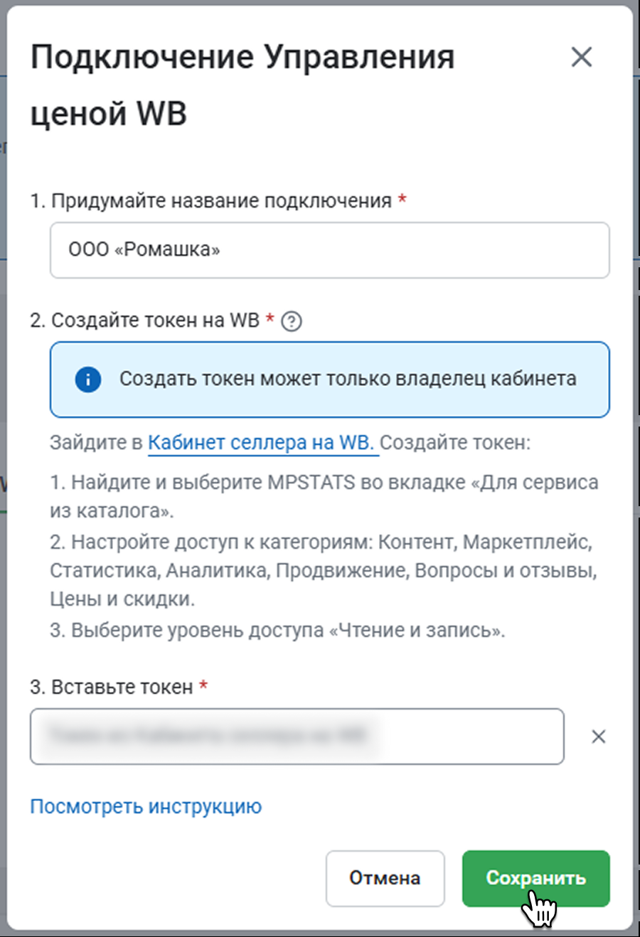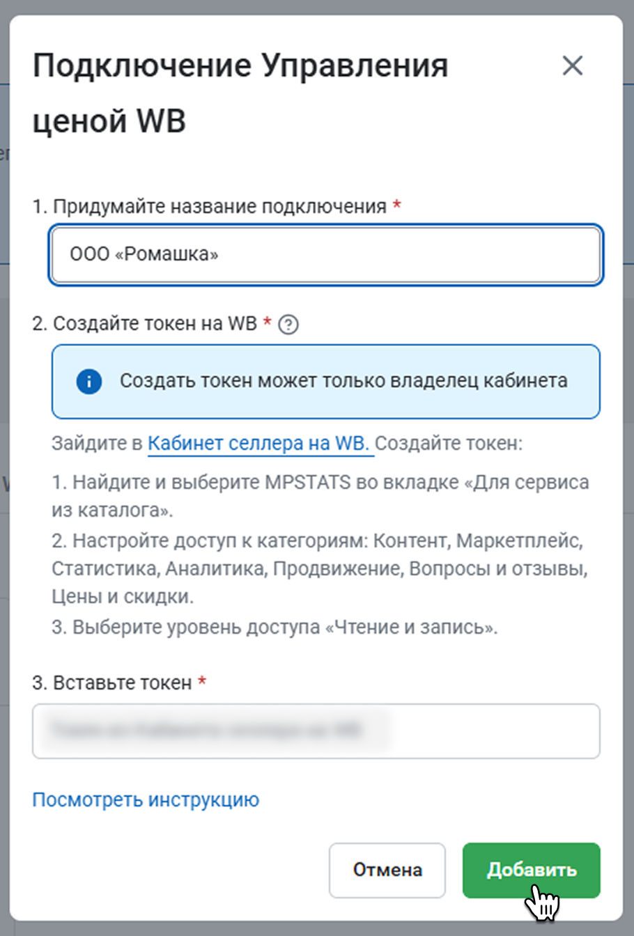 Введите название подключения (это может быть любое удобное название токена) и скопированный API-токен из Кабинета селлера на WB. Нажмите кнопку Добавить.