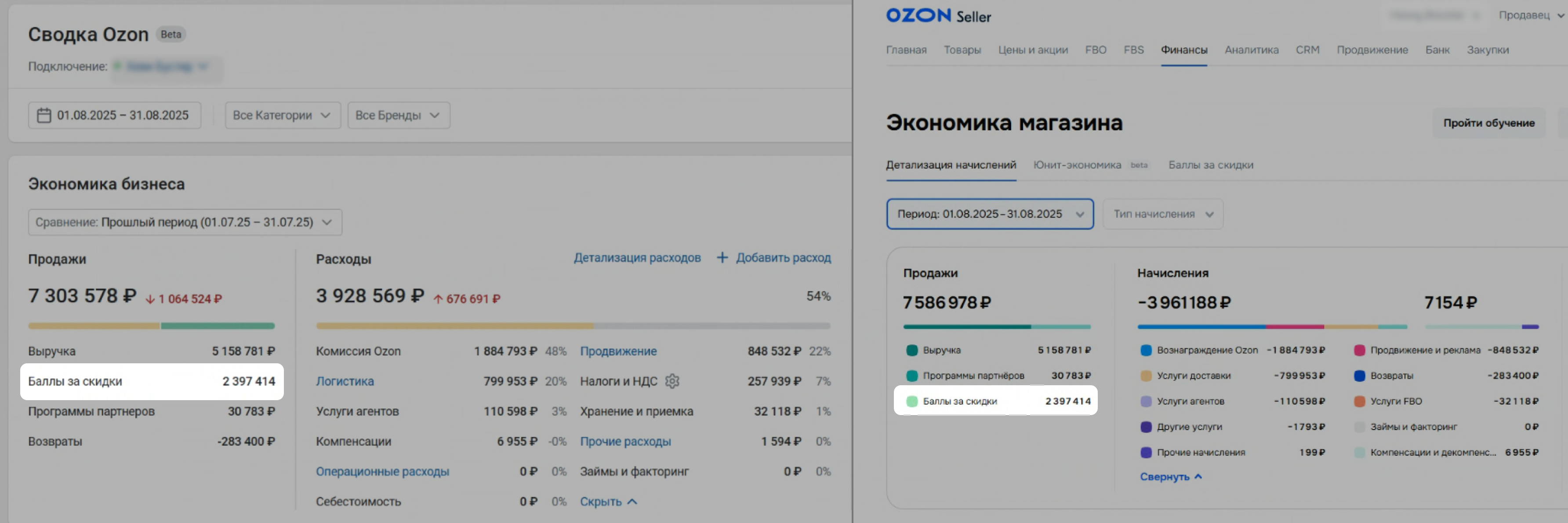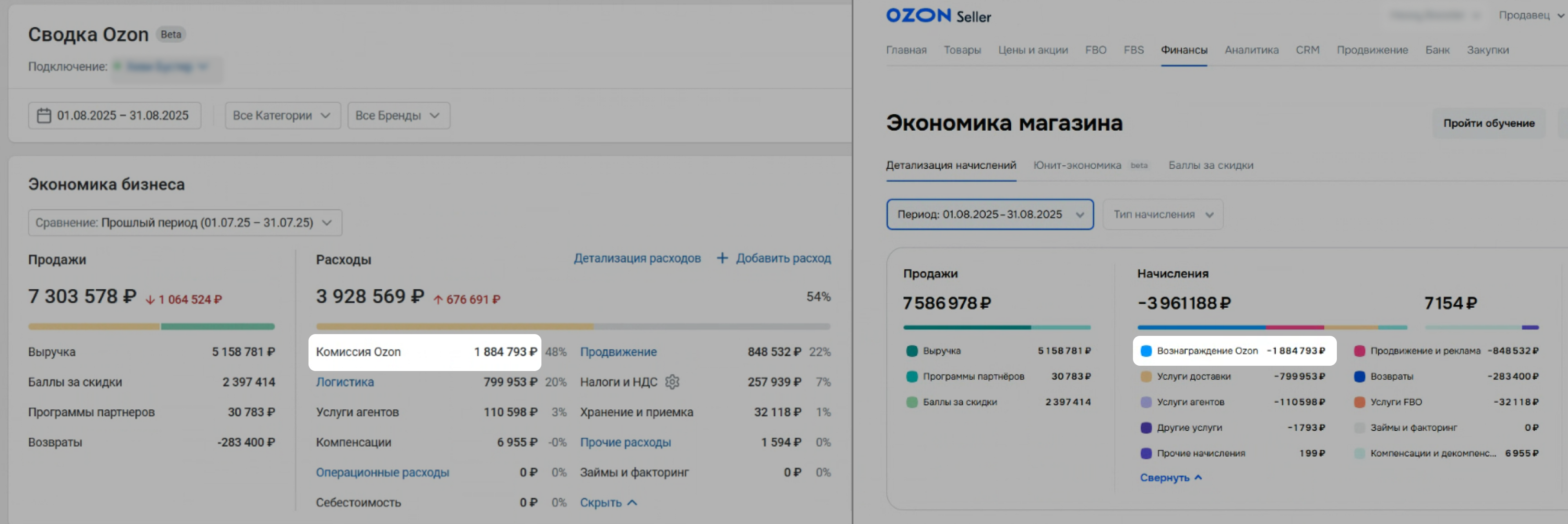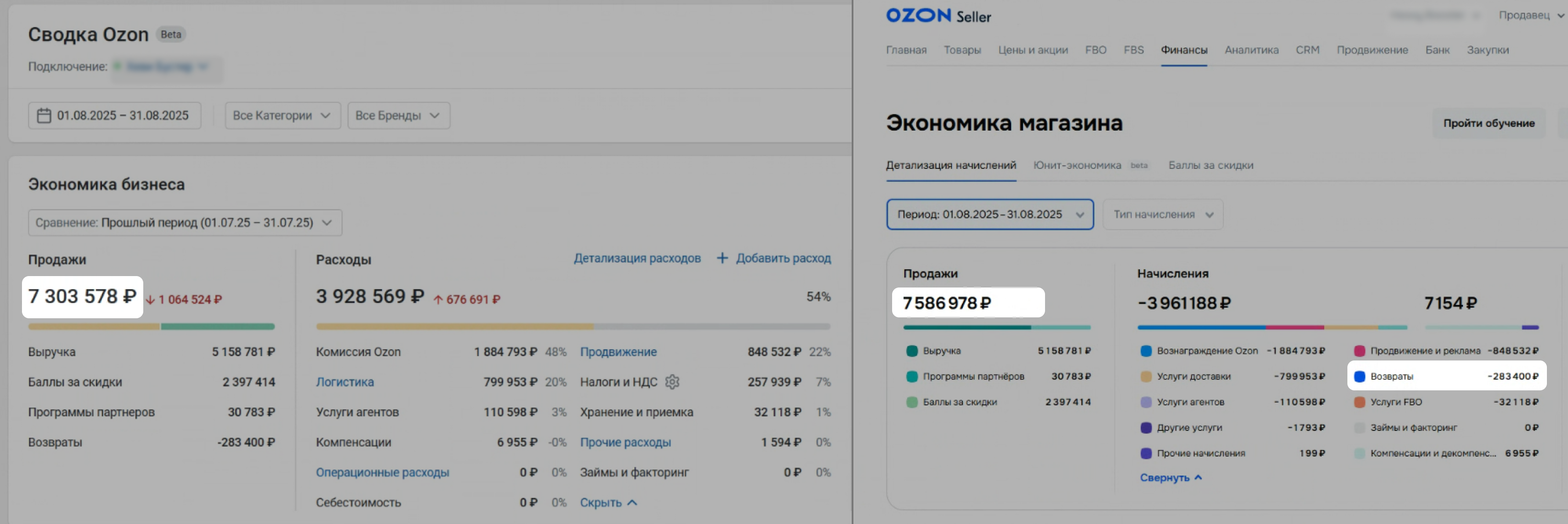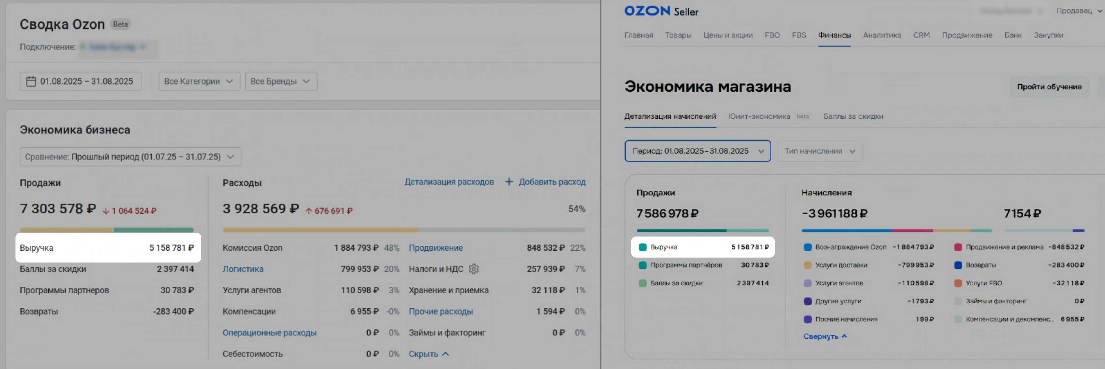 Откройте на Ozon страницу Финансы → Экономика магазина. Задайте тот же период, что и в Сводке.
