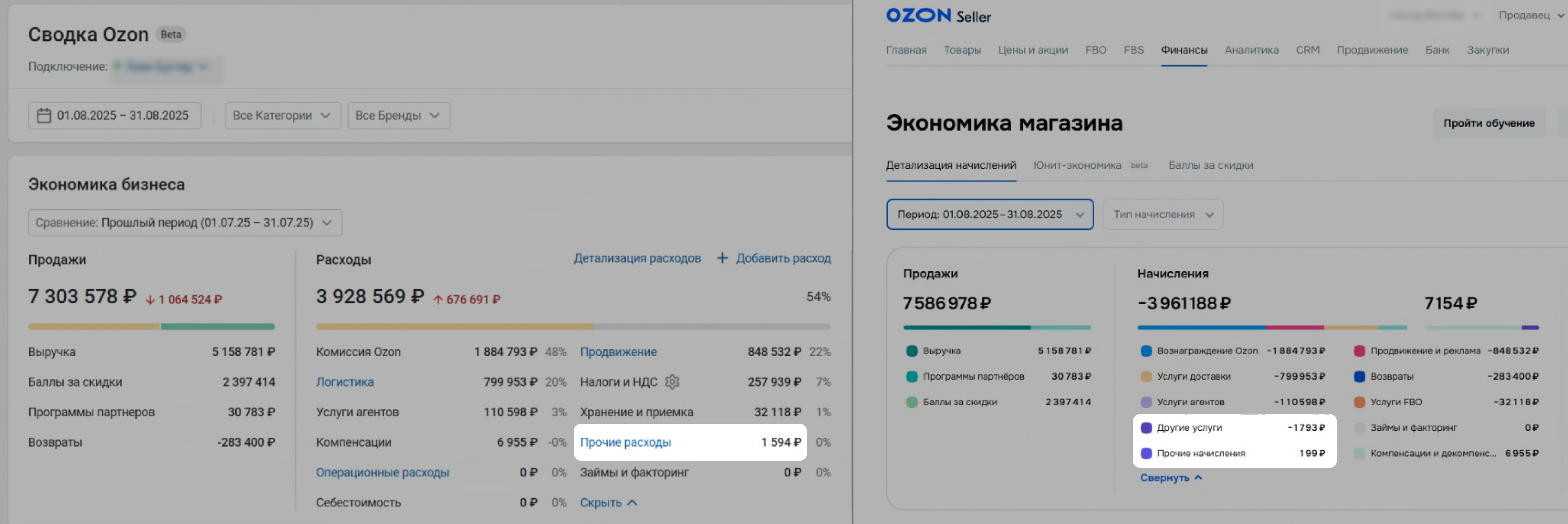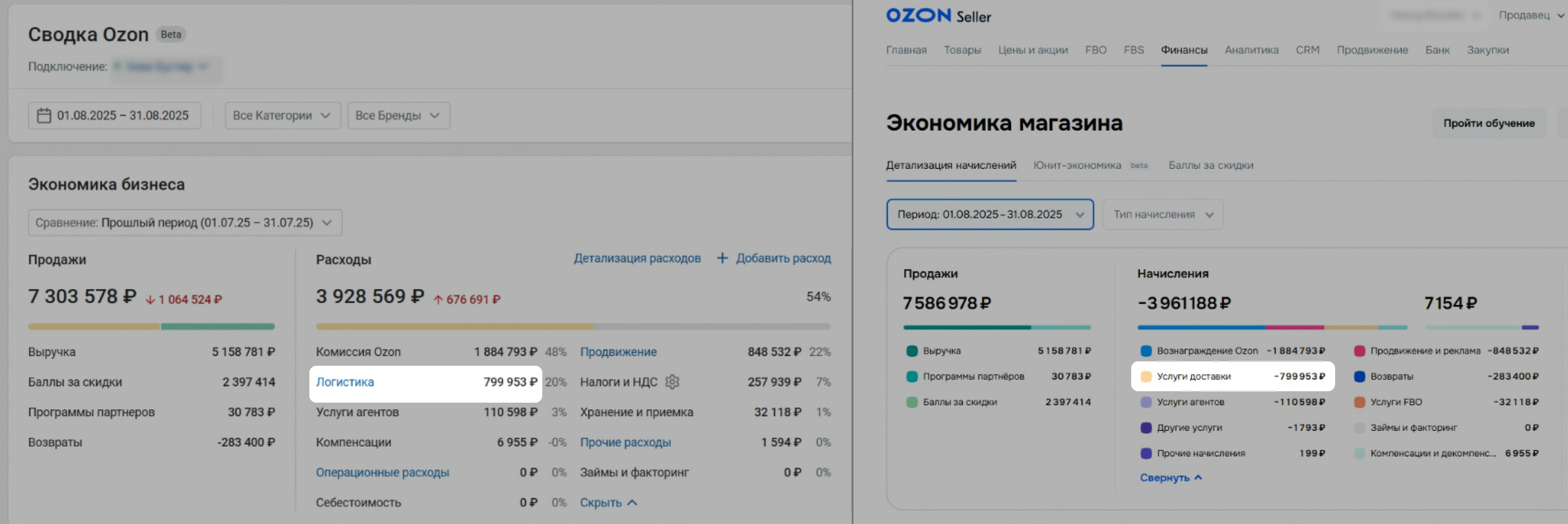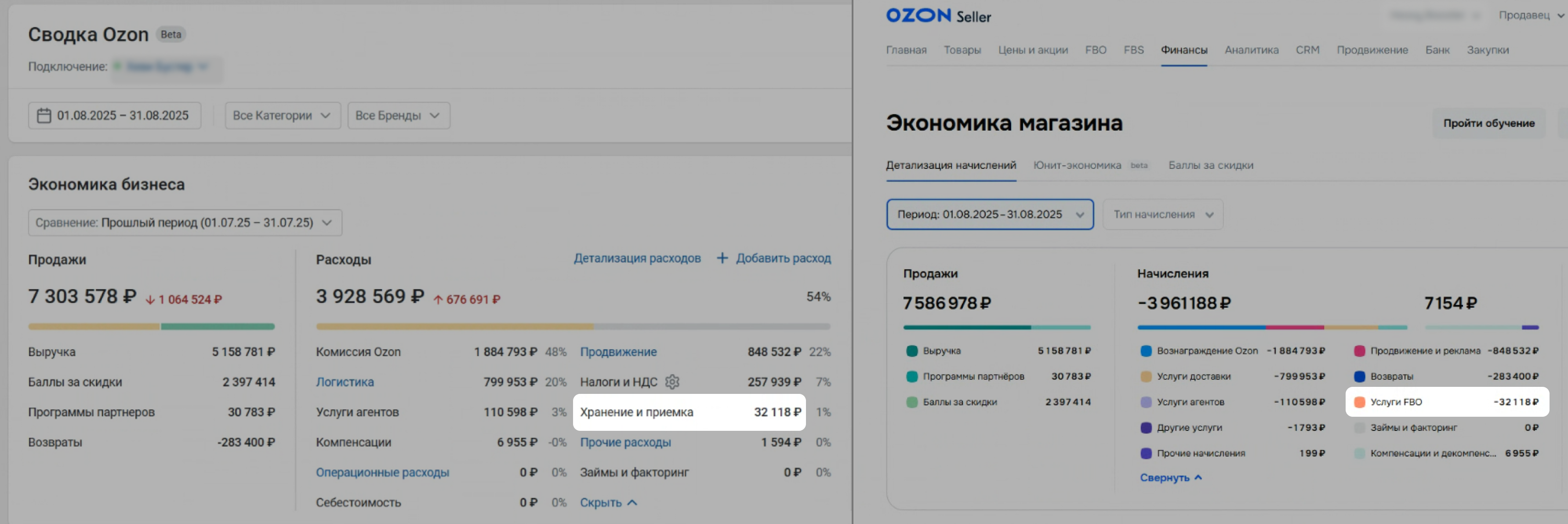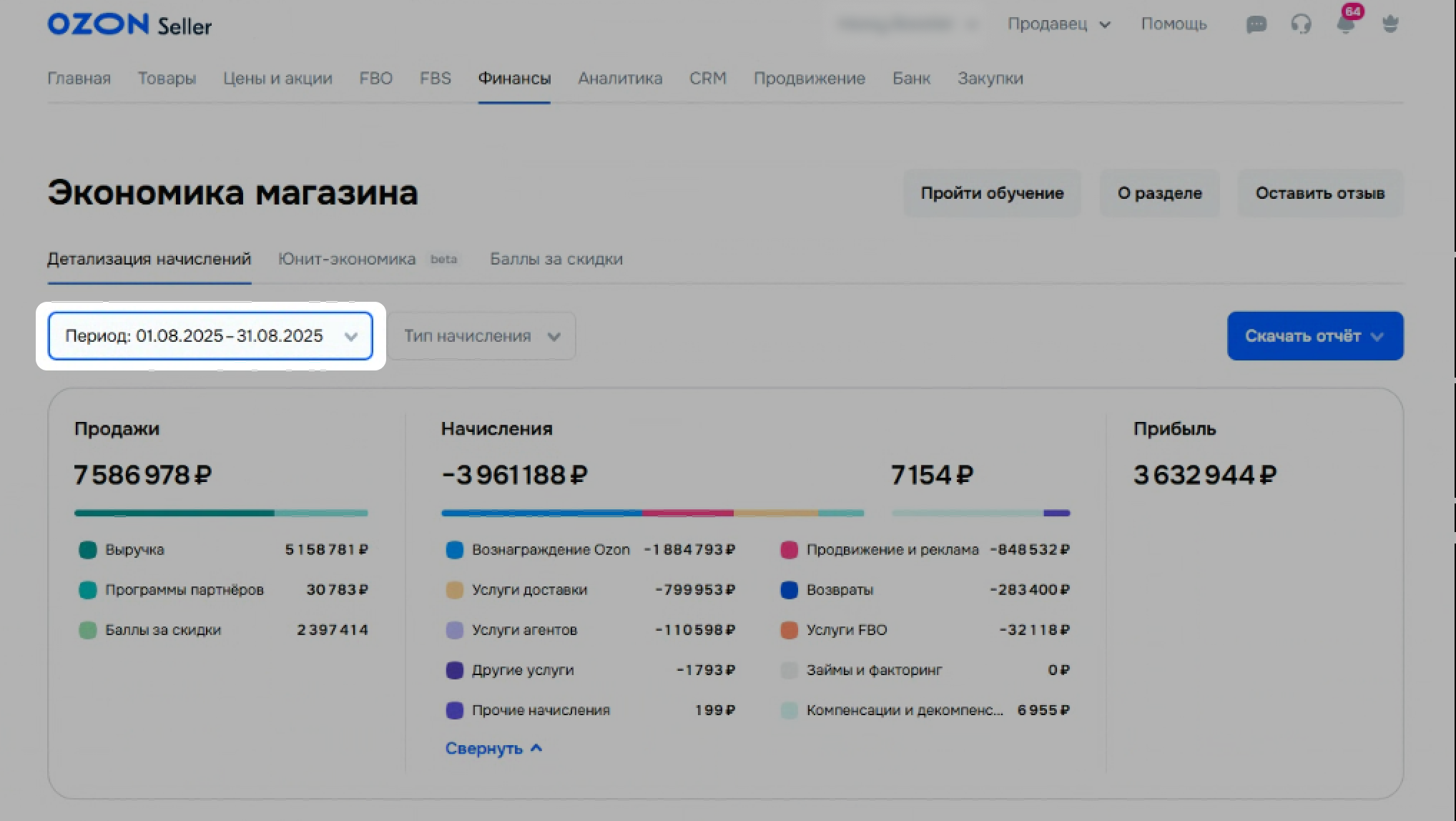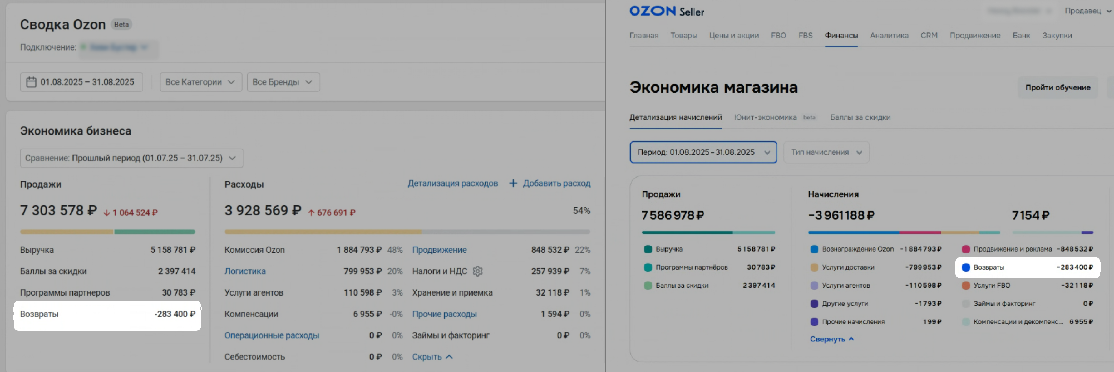 Откройте на Ozon страницу Финансы → Экономика магазина. Задайте тот же период, что и в Сводке.
