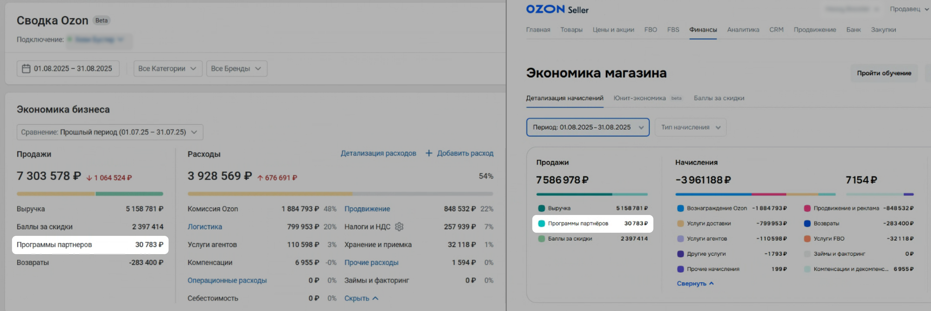 Суммы за Программы партнеров в Сводке и на Ozon должны совпадать.
