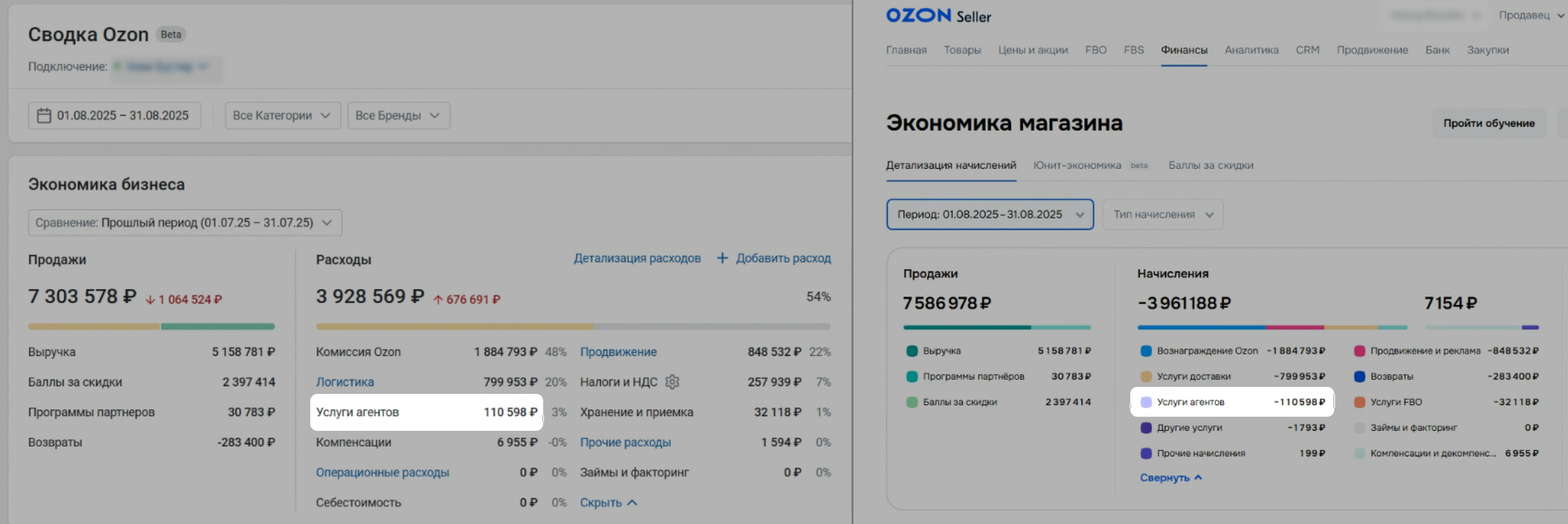 Суммы Услуги агентов в Сводке и на Ozon должны совпадать.
