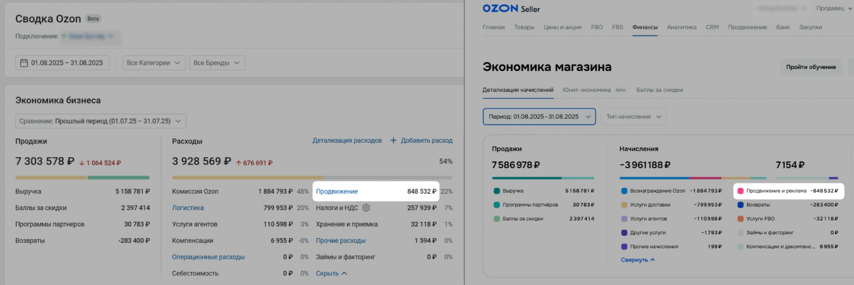 Сумма Продвижение в Сводке должна совпадать с Продвижение и реклама на Ozon.