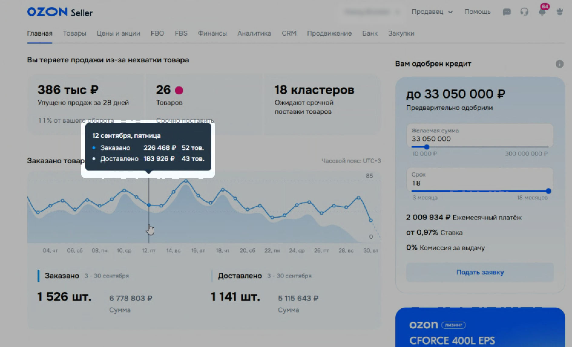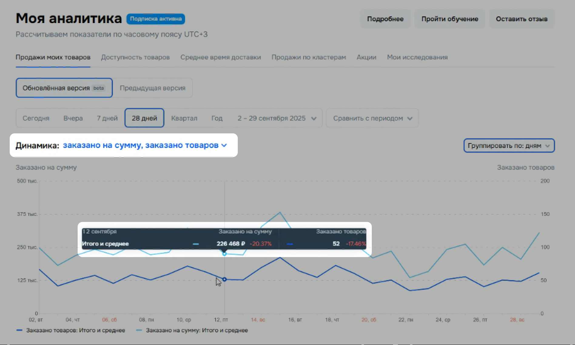 В Кабинете селлера на Ozon такие же показатели должны отображаться на странице Моя аналитика. Выберите в настройках графика Заказано на сумму и Заказано товаров. Найдите на графике тот же день – сумма и количество заказов должны совпасть.