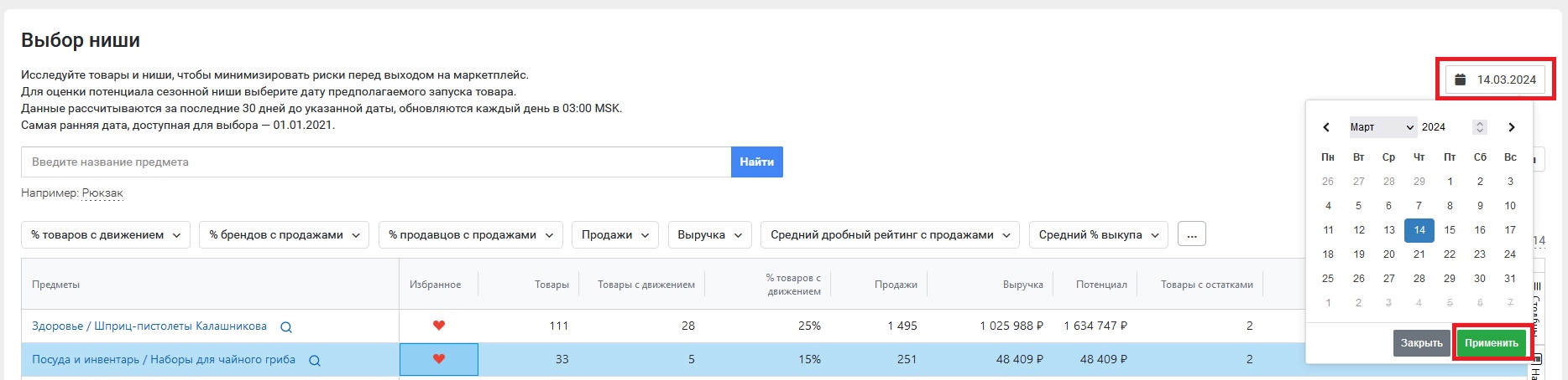 С помощью инструмента можно не только оценить актуальное состояние ниши, но и заглянуть в сезонные категории и понять, когда стоит запускать тот или иной товар. Для этого нужно выбрать дату предполагаемого запуска товара. Отчет перестроится и покажет статистику за 30 дней до выбранной даты.