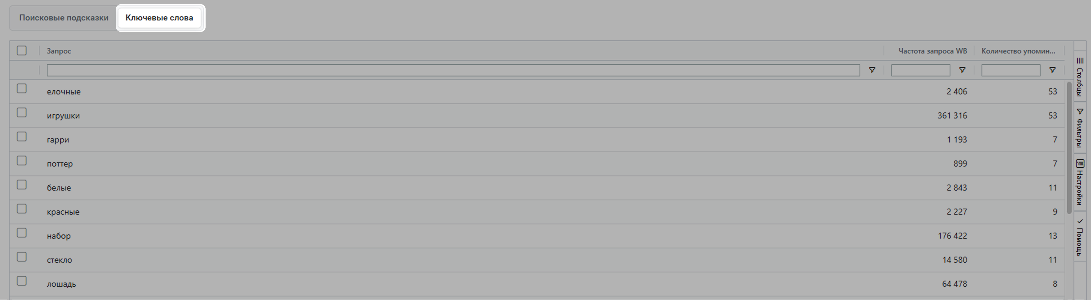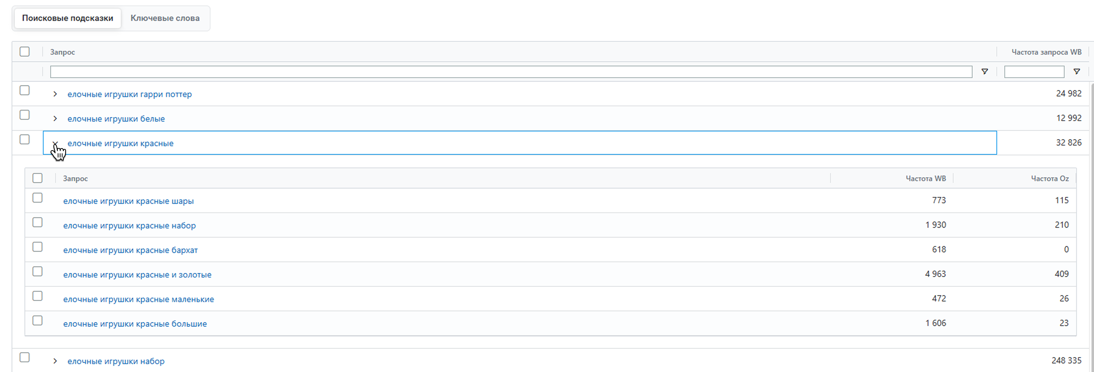 Система покажет поисковые подсказки первого уровня вложенности. Для каждой подсказки показываем Частоту запроса WB – сколько раз пользователи маркетплейса вводили такой запрос за 30 дней.