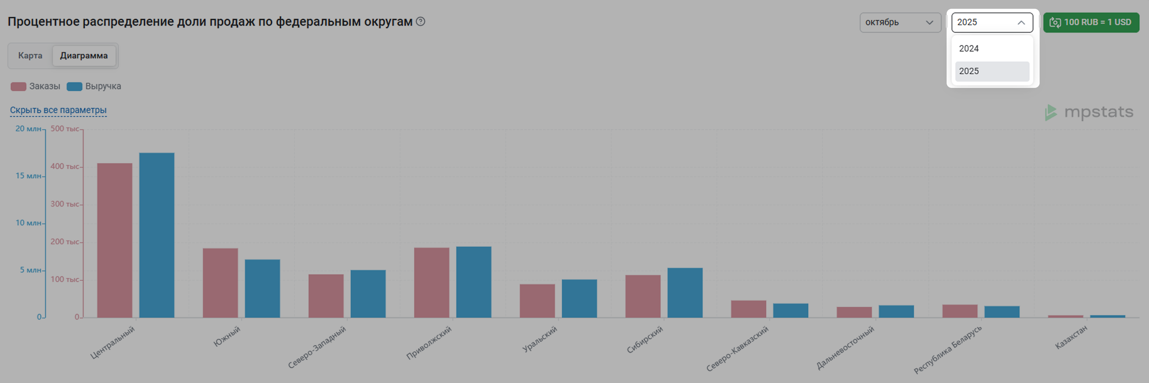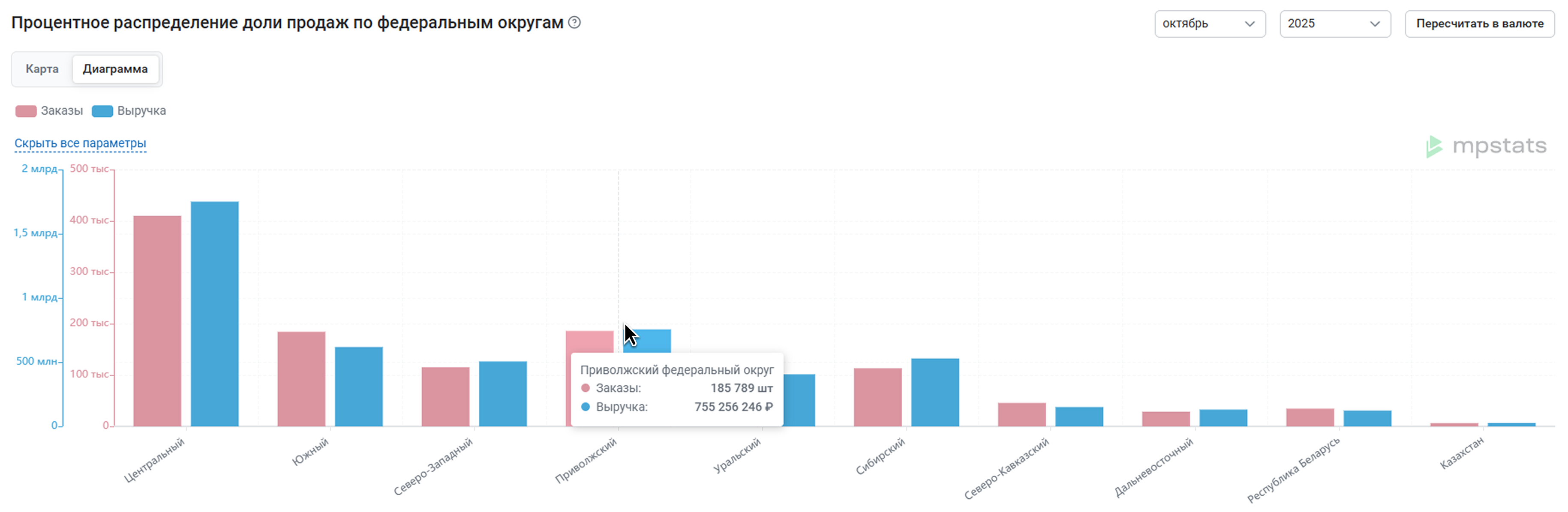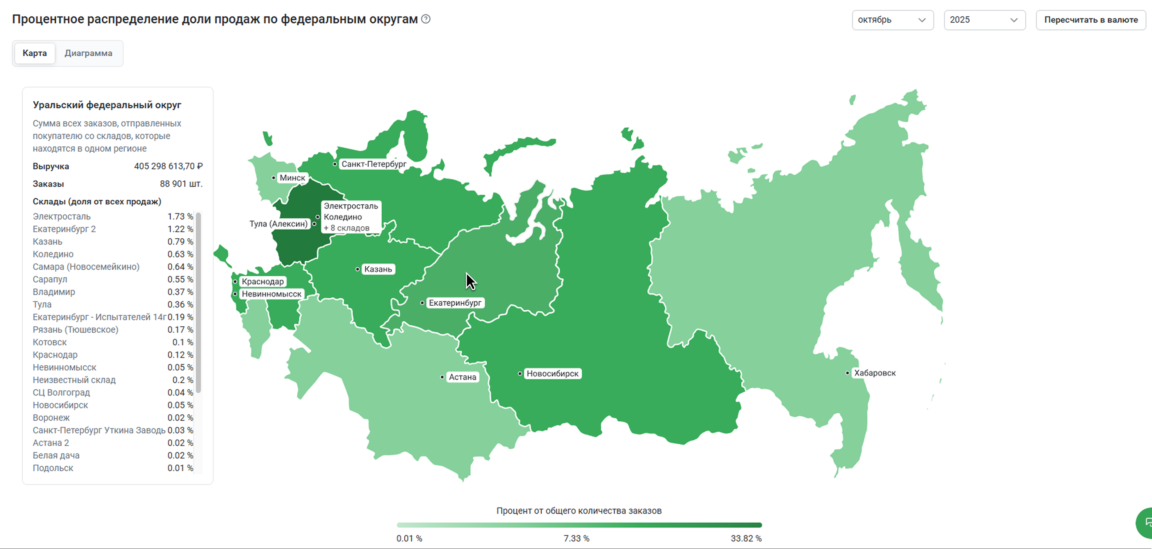 Если наведете мышкой на регион, появится общая информация о заказах и выручке в предмете в этом регионе, а еще процентное распределение складов, с которых доставляются заказы.