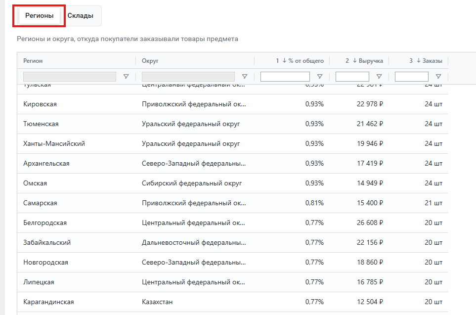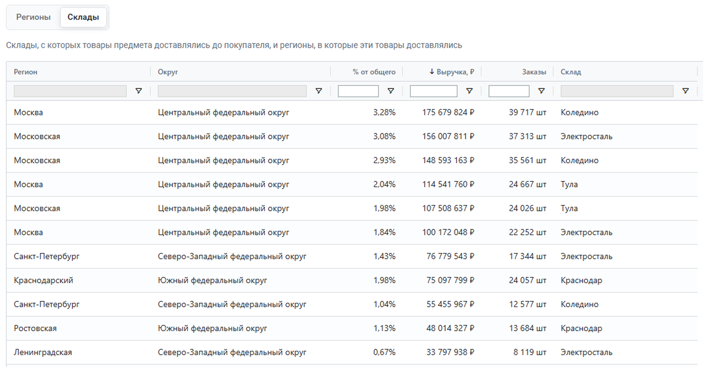 В таблице вы найдете склады, с которых товары предмета доставлялись до покупателя, и регионы и округа, в которые эти товары доставлялись. Здесь тоже есть процент от общего количества заказов предмета в этом округе, общая выручка региона и количество заказов.