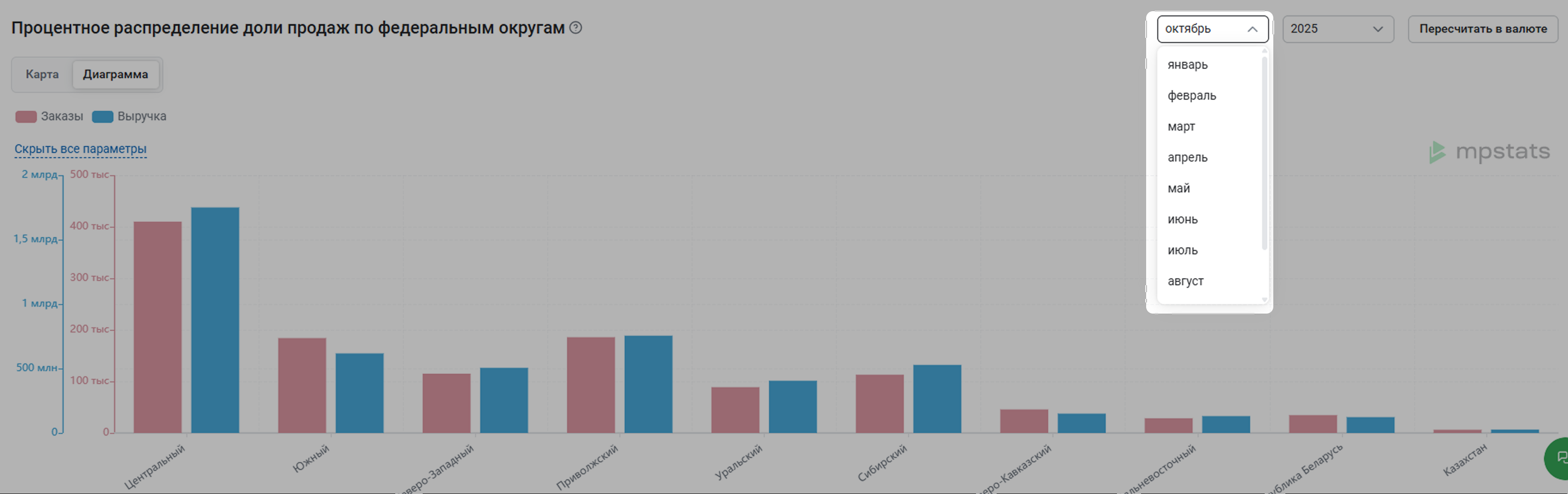 По умолчанию показываем данные за текущий месяц, но вы можете выбрать любой другой в выпадающем списке. Так можно сравнить, как менялся спрос в регионах в разные месяцы.
