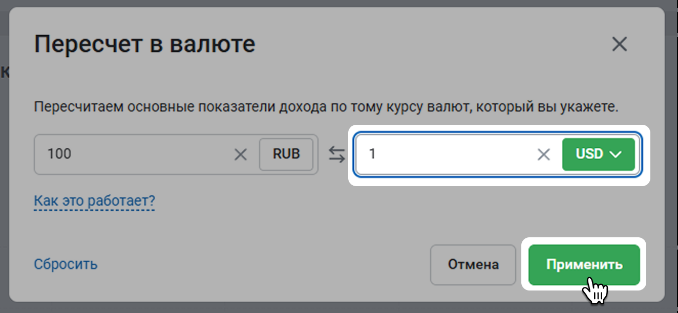 Например, сейчас выручка 10 000 ₽. Вы указываете, что 1 $ равен 100 ₽. Когда вы нажмете Применить, в таблице в графе Выручка будет 100.