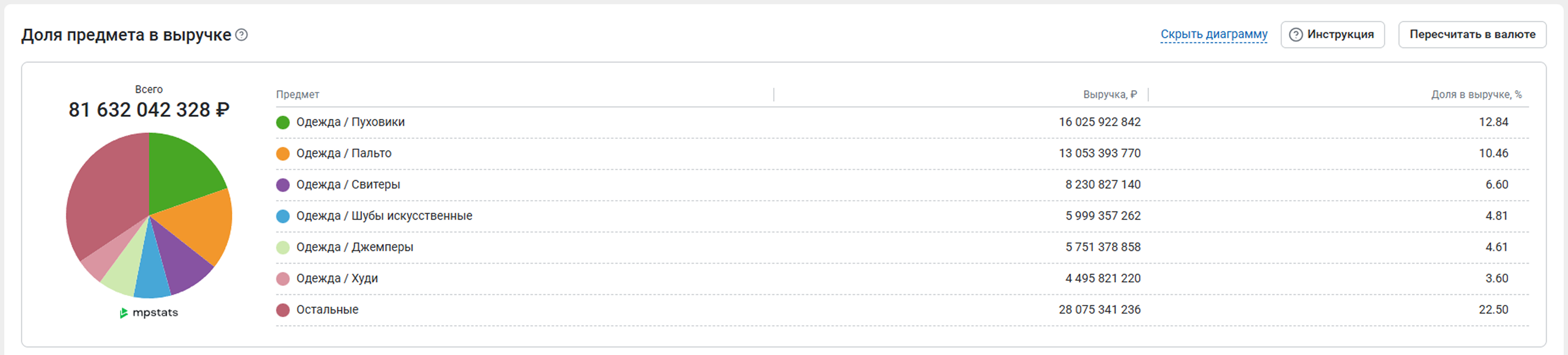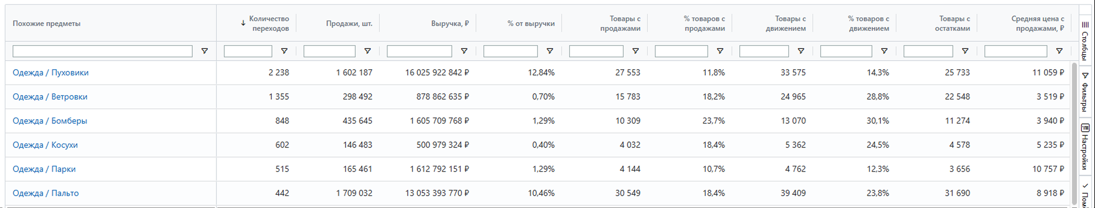% от выручки – доля выручки предмета от общей выручки всех товаров по похожим предметам