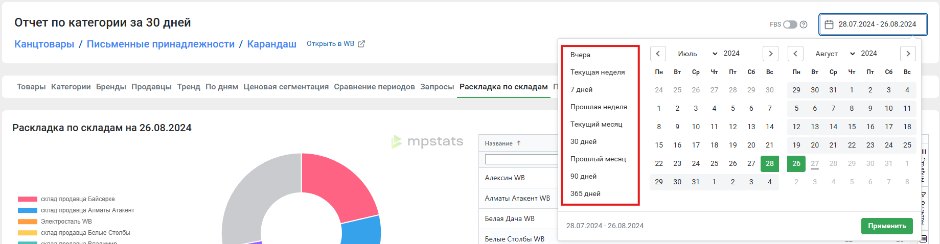 Отчет Раскладка по складам показывает информацию о текущих остатках товаров по тем складам, которые использует продавец или бренд. Отчет покажет, куда отгружают товар конкуренты – вы сможете определить возможный спрос на товар и понять, куда отгружать свои товары. Данные о складах и остатках отображаются на диаграмме и в виде таблицы.