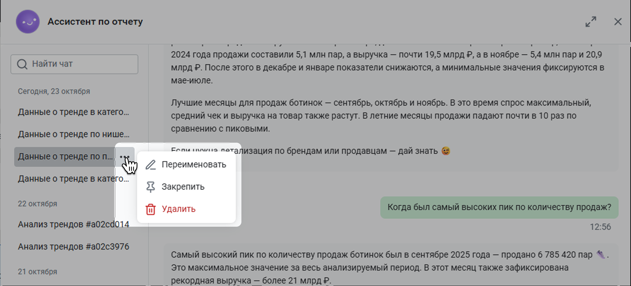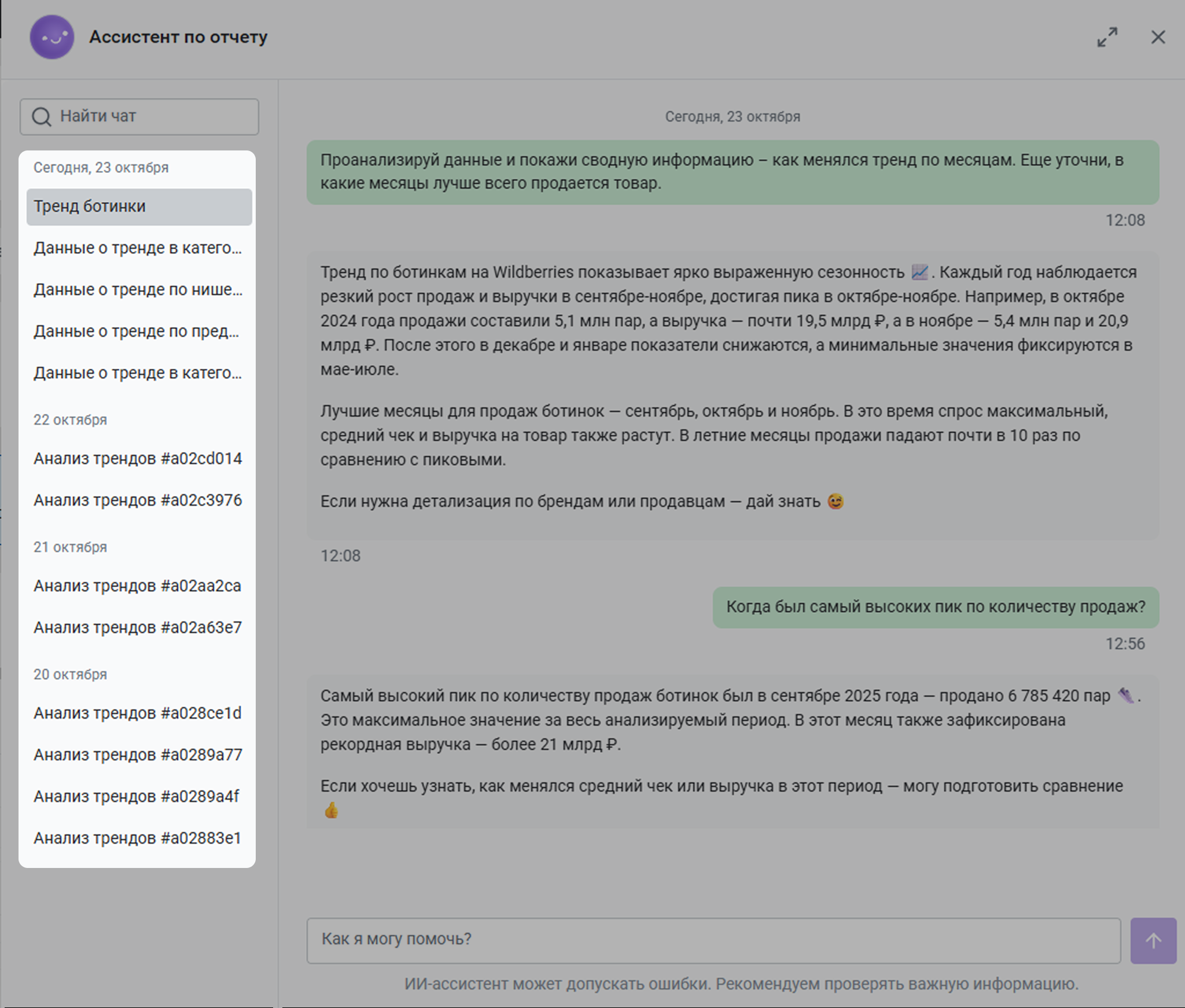История ваших запросов по тренду в разных нишах и категориях сохраняется в виде отдельных чатов слева.