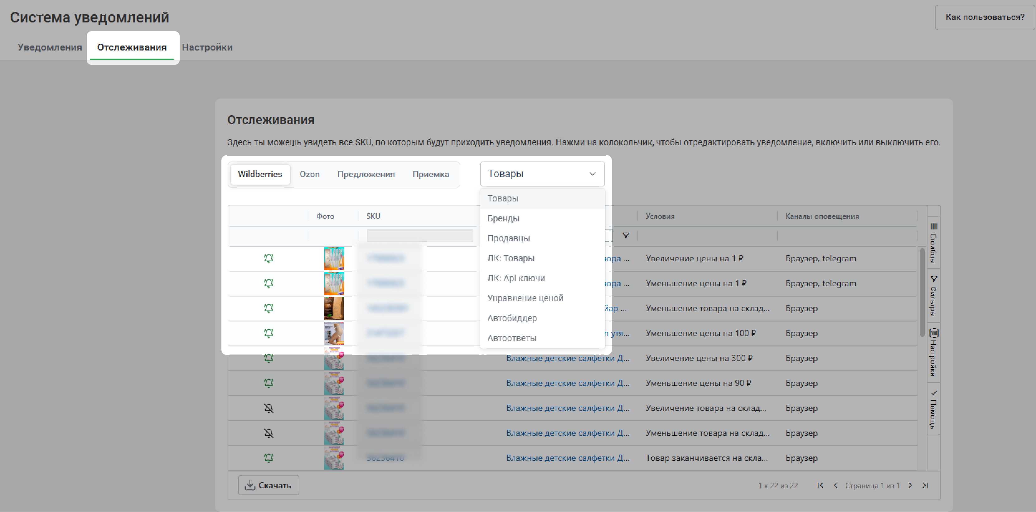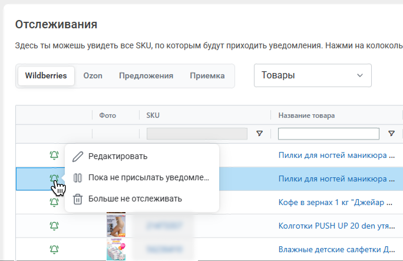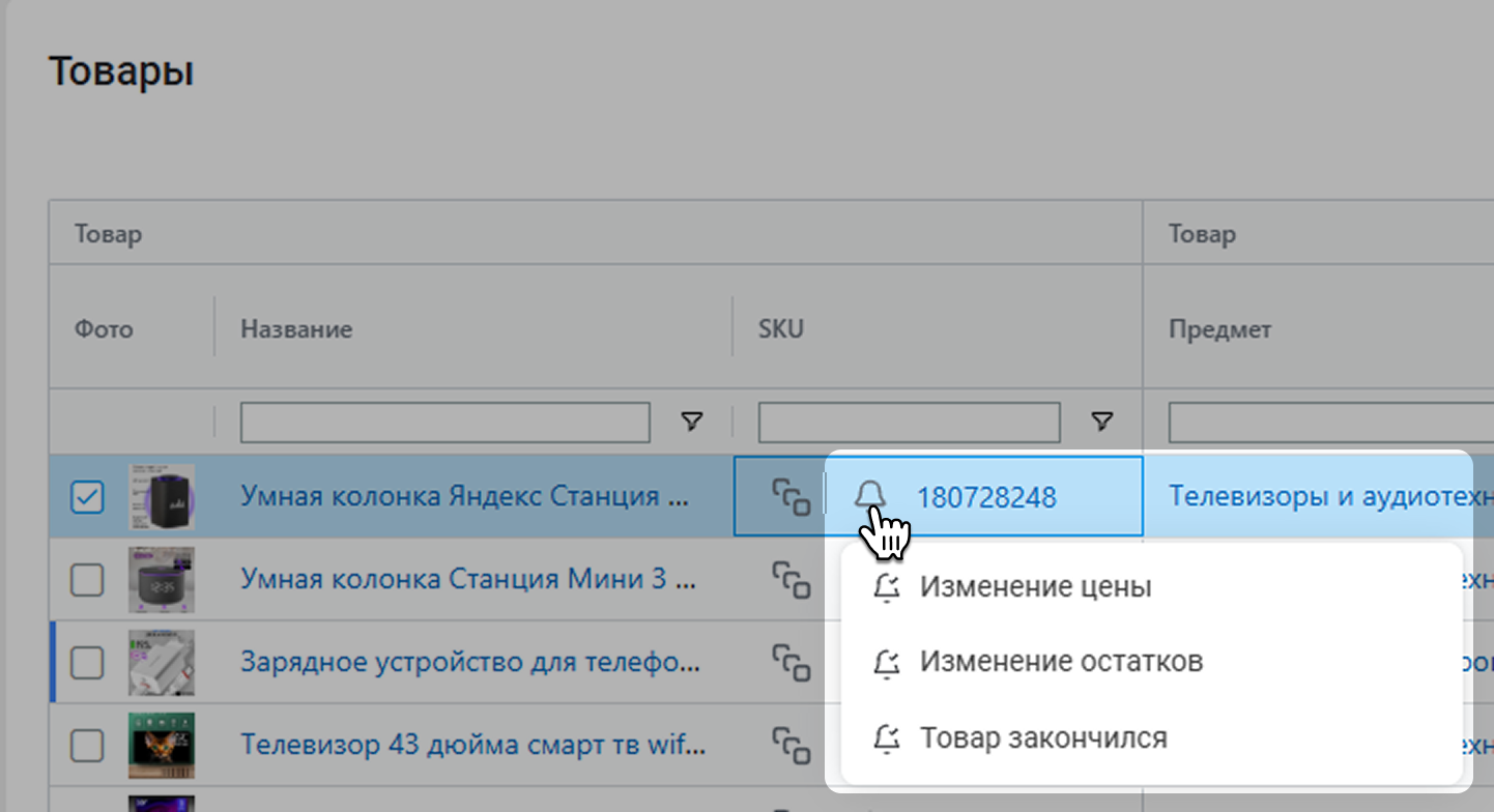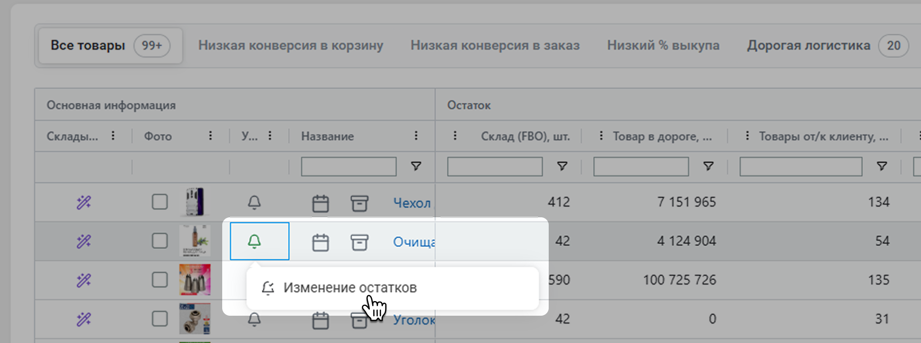 Чтобы настроить уведомления по конкретному товару, найдите его в таблице и нажмите на колокольчик, а затем – Изменение остатков.