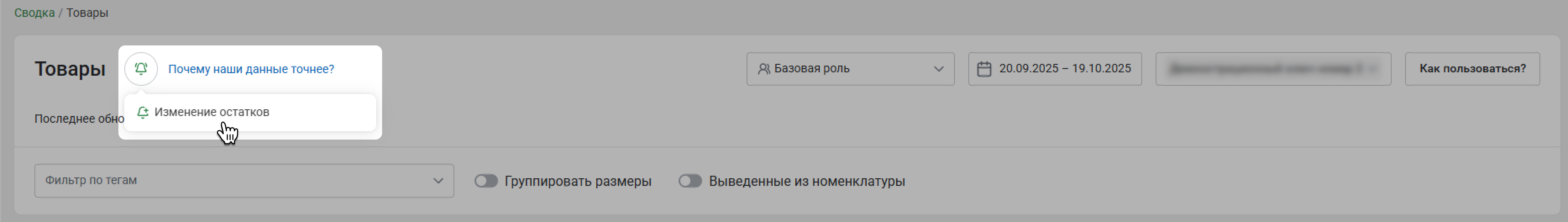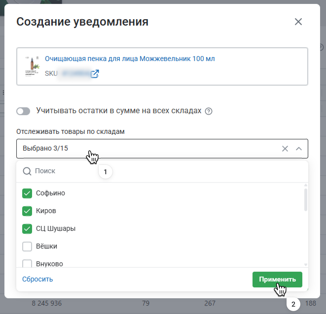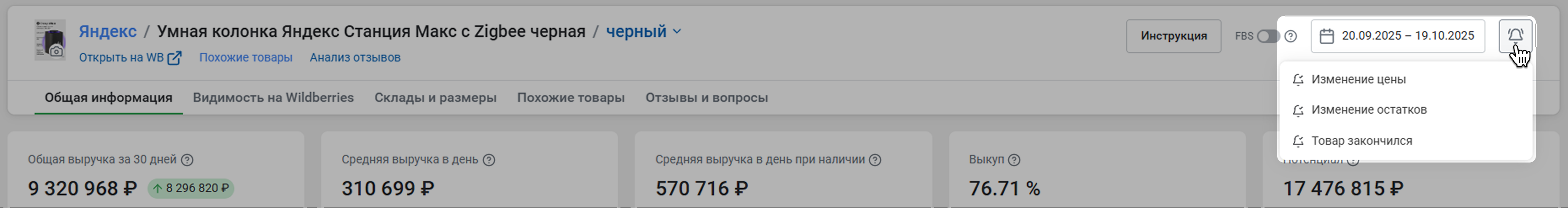 Чтобы настроить уведомления по конкретному товару, найдите его в таблице и нажмите на колокольчик, а затем – Изменение остатков.