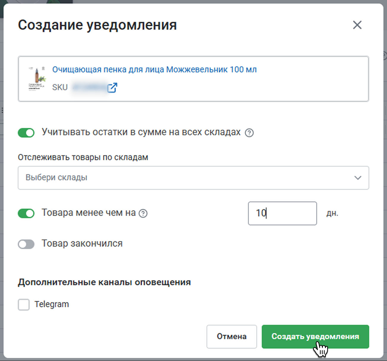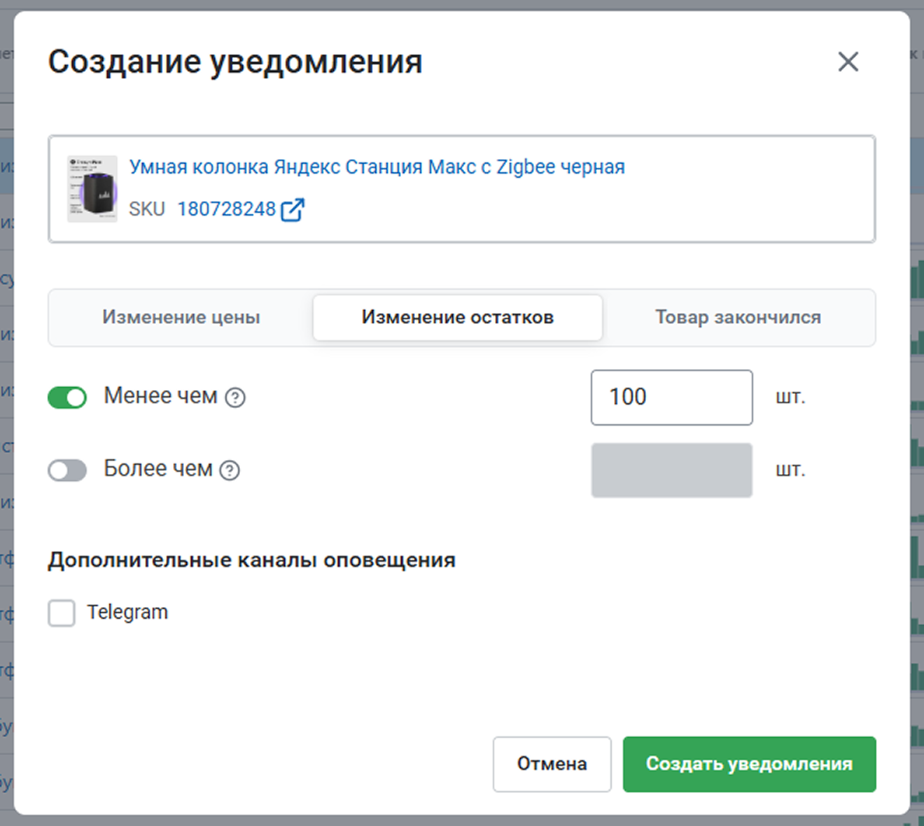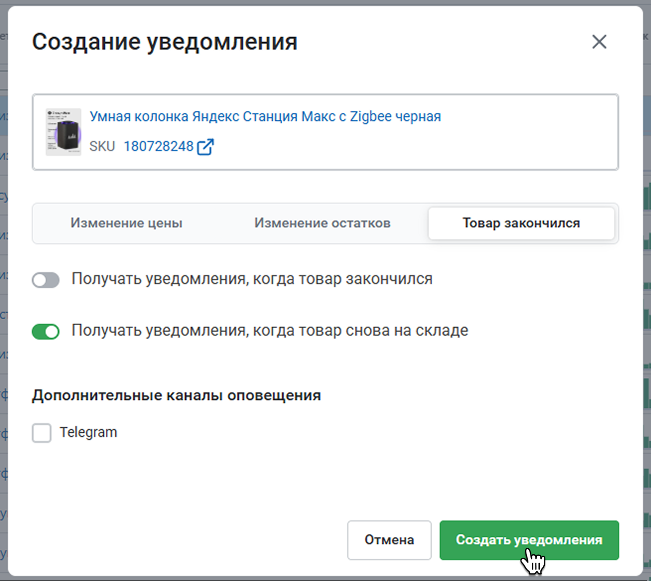 Можно получать уведомления по одному товару или сразу по всем товарам подключения.