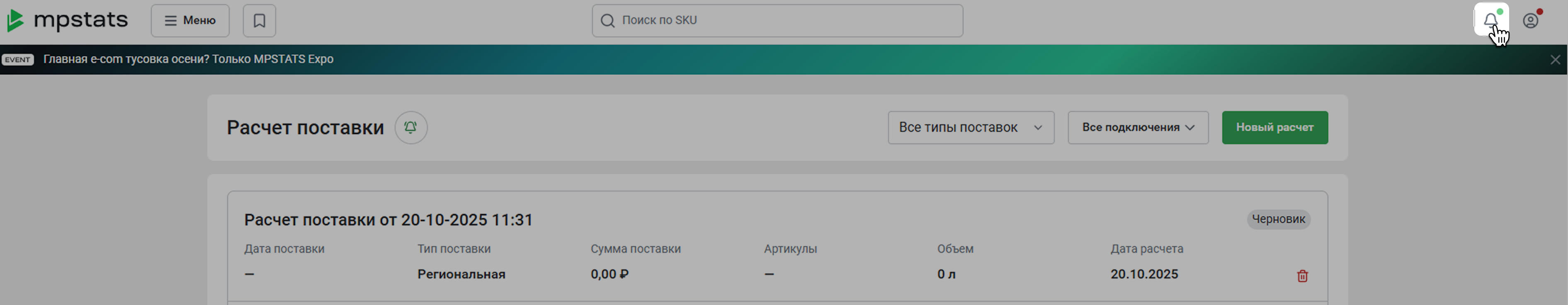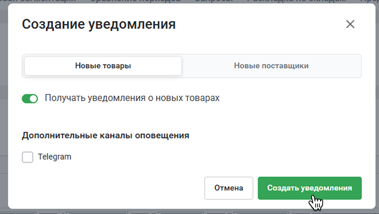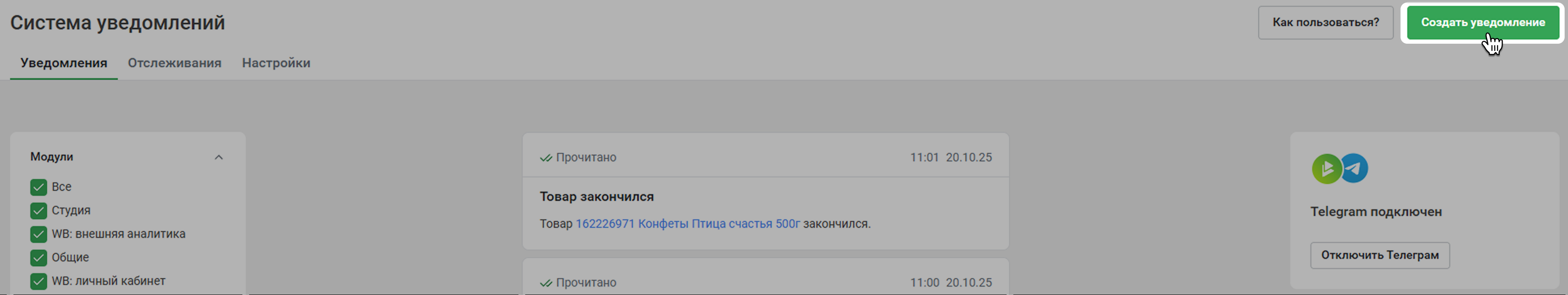 Или зайдите в любой отчет Внешней аналитики WB или Внешней аналитики Ozon и нажмите на колокольчик.