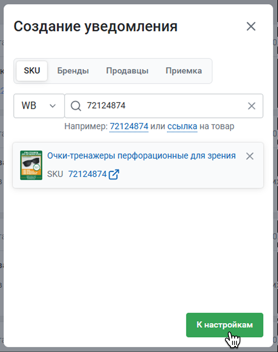 Когда вы введете ссылку на товар или SKU, мы покажем товар. Нажмите К настройкам.