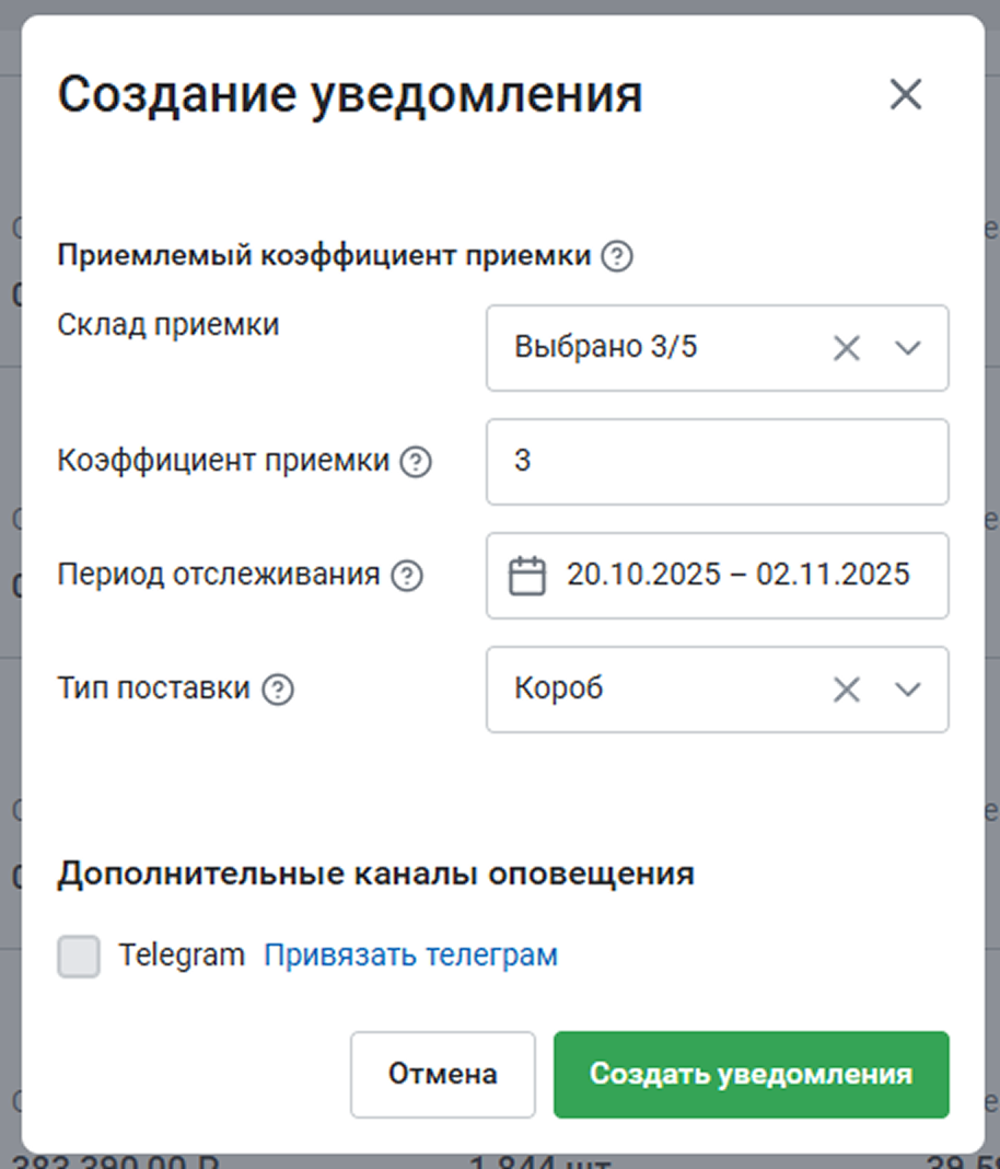 Проверяем коэффициенты несколько раз в минуту. Как только они подойдут под ваши условия, мы пришлем уведомление. Дополнительно подсветим, если приемка будет самой дешевой