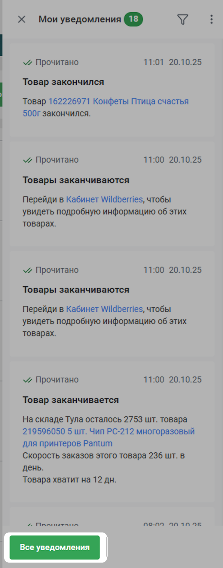Вы можете переключаться между уведомлениями Ozon и Wildberries и выбирать, какие уведомления показать.