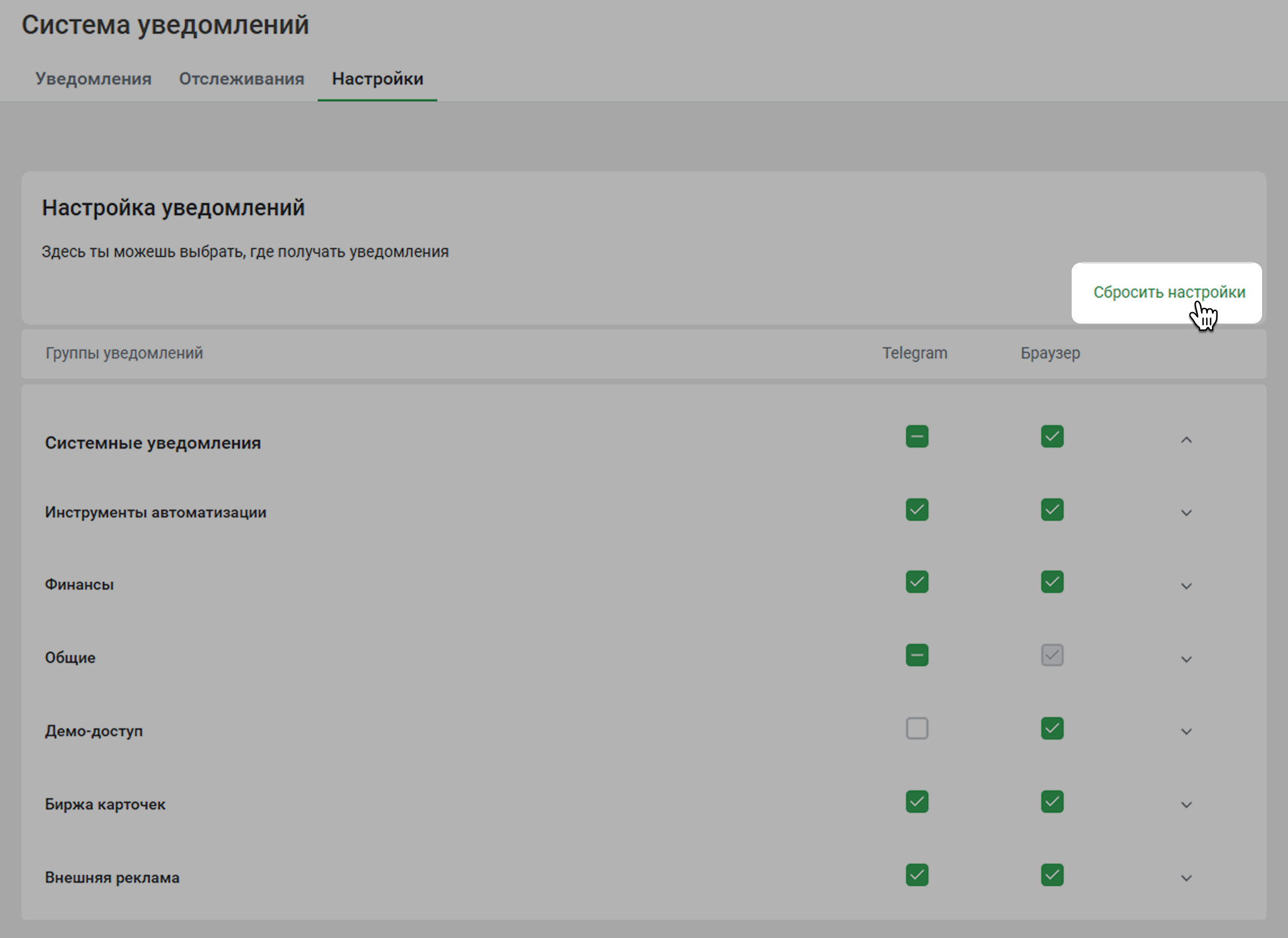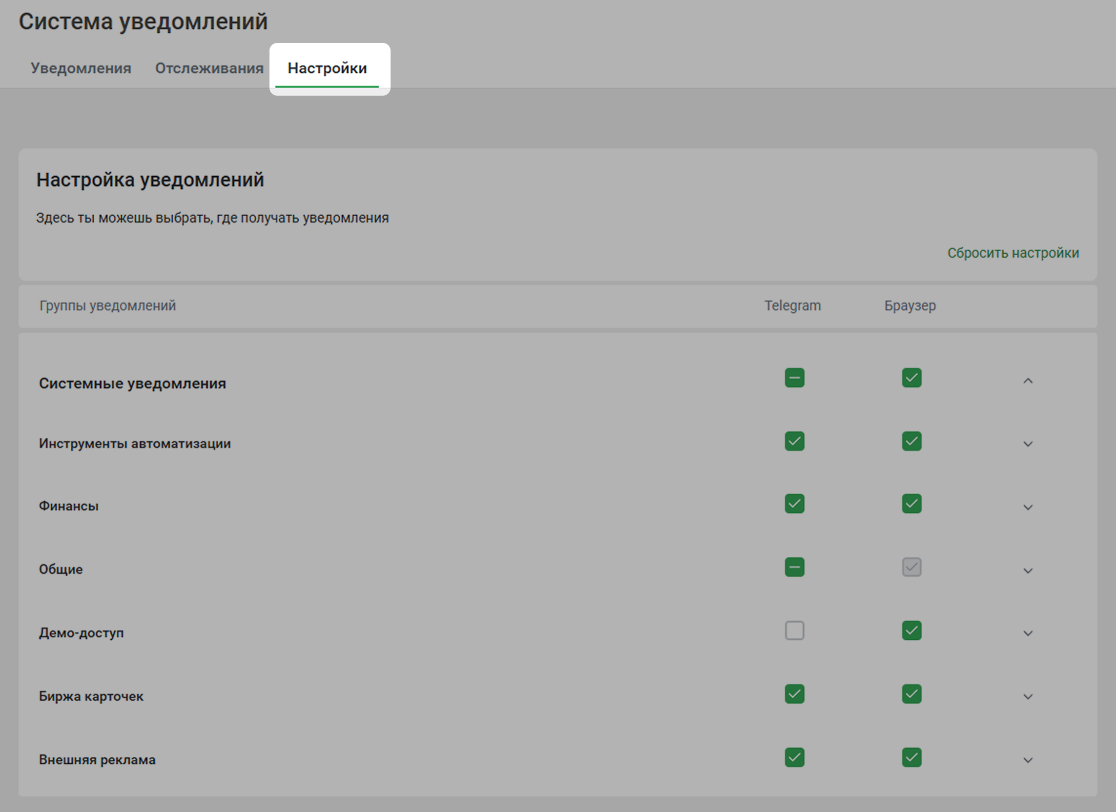 Во вкладке Настройки можно выбрать, где получать уведомления. Вы можете настроить их для Telegram и браузера. Для этого отметьте нужные уведомления галочками.