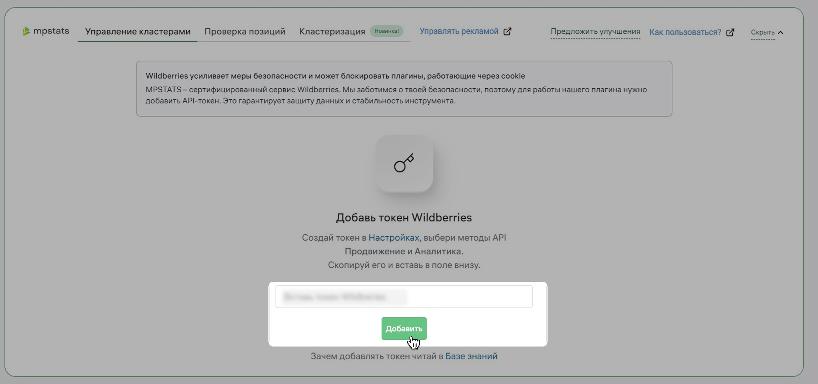 Перейдите в Рекламный кабинет Wildberries. Зайдите в любую свою рекламную кампанию. В плагине перейдите во вкладку Управление кластерами и вставьте токен. Нажмите Добавить.