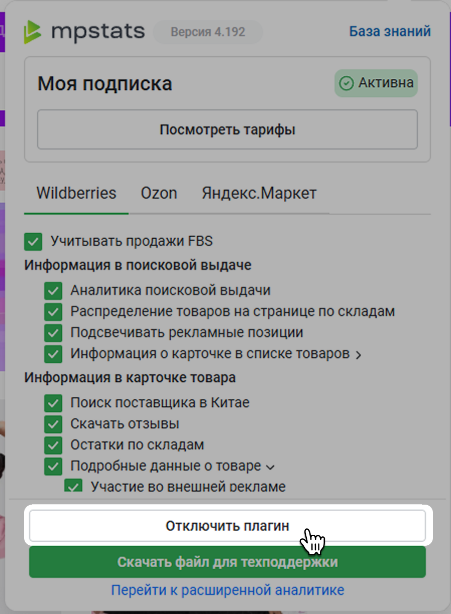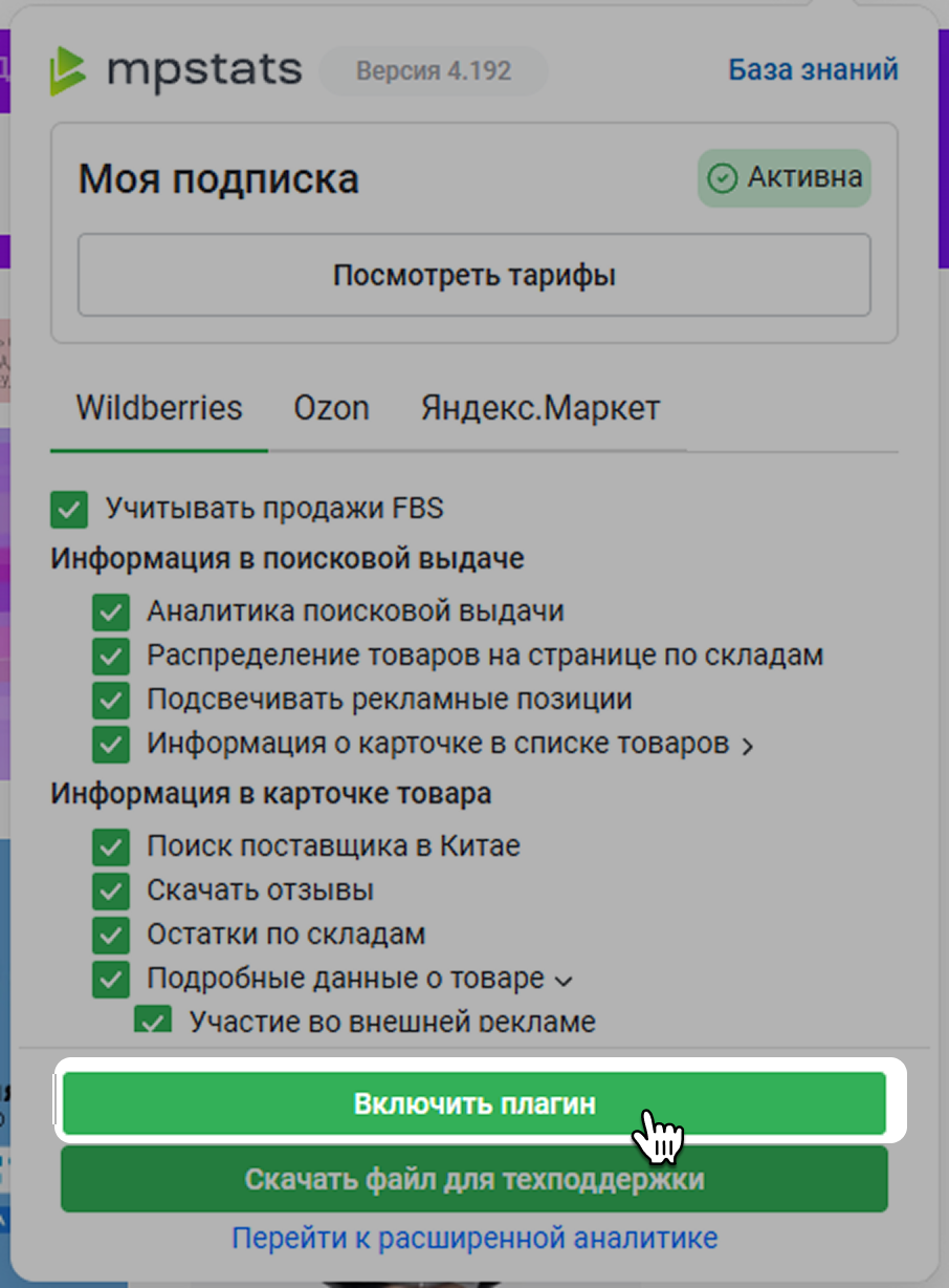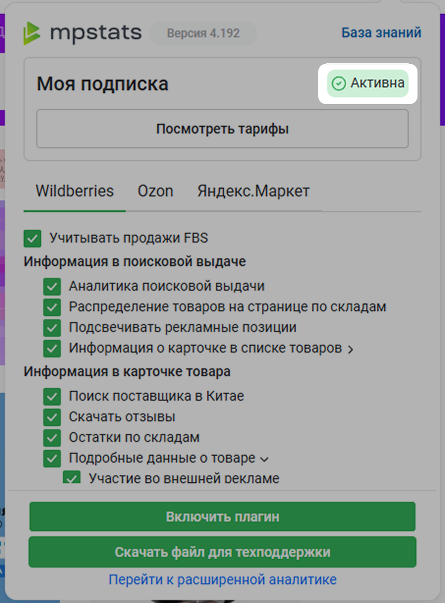 В плагине отображается статус вашей подписки на MPSTATS. Их может быть три: