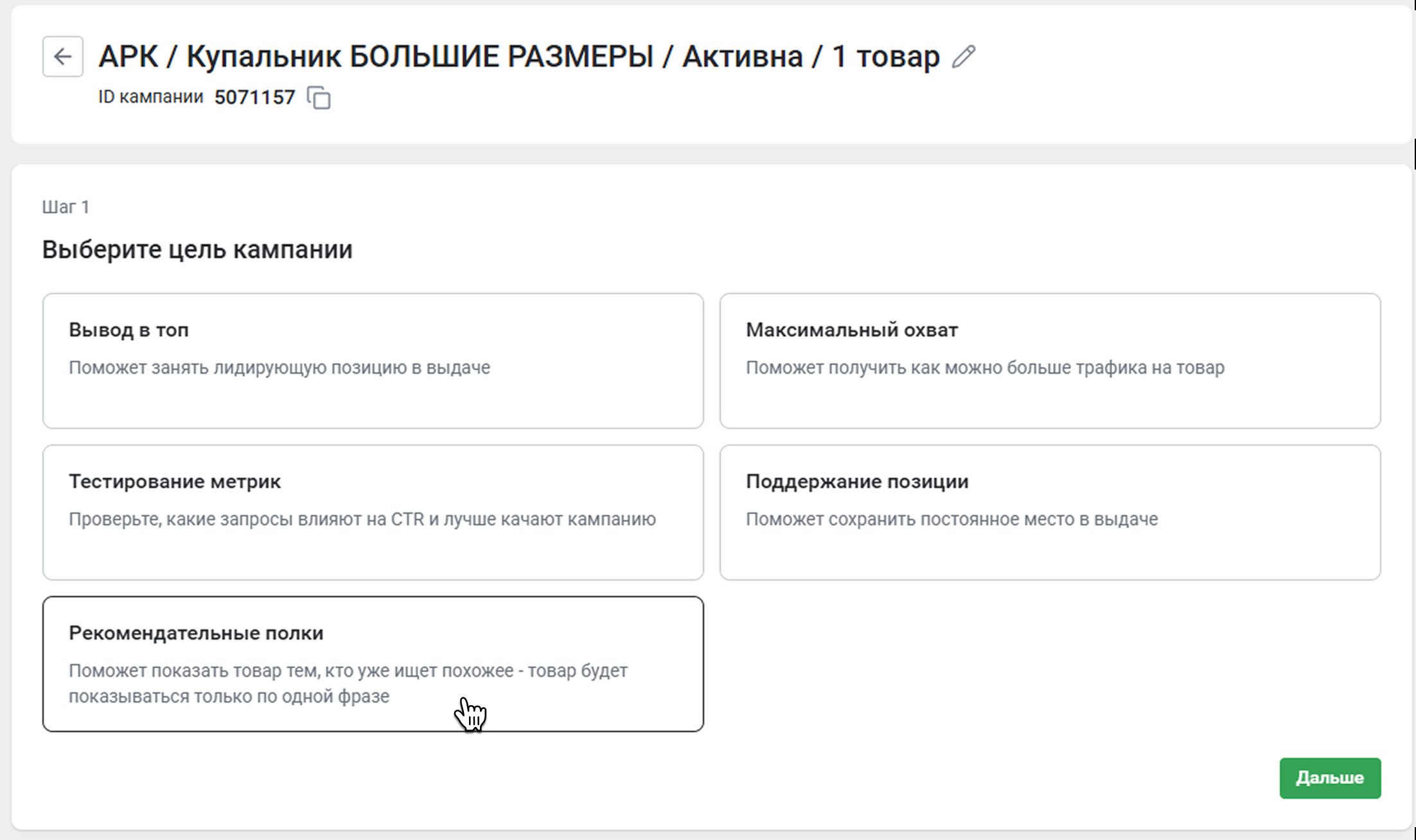 Если выбрана такая цель, Автобиддер будет придерживаться стратегии Лучшая позиция – то есть стремиться поднять карточку как можно выше в выдаче.