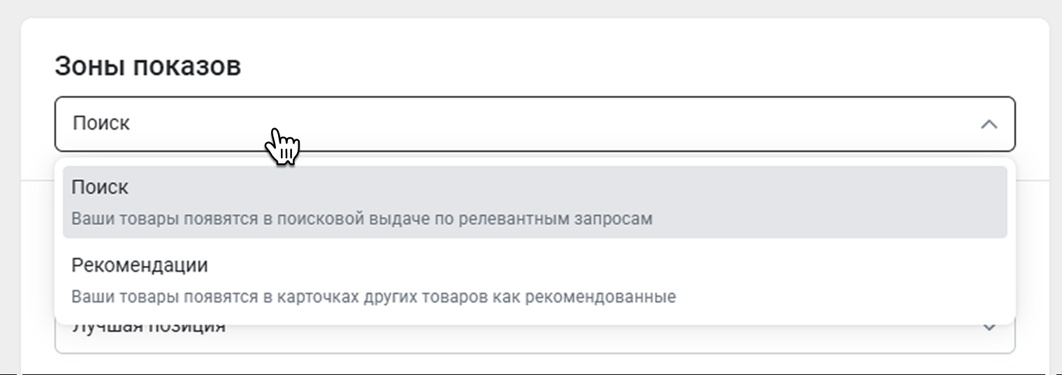 Для стратегий Лучшая позиция и Оптимальная ставка вы можете выбрать, куда Автобиддер будет пытаться поместить вашу карточку: