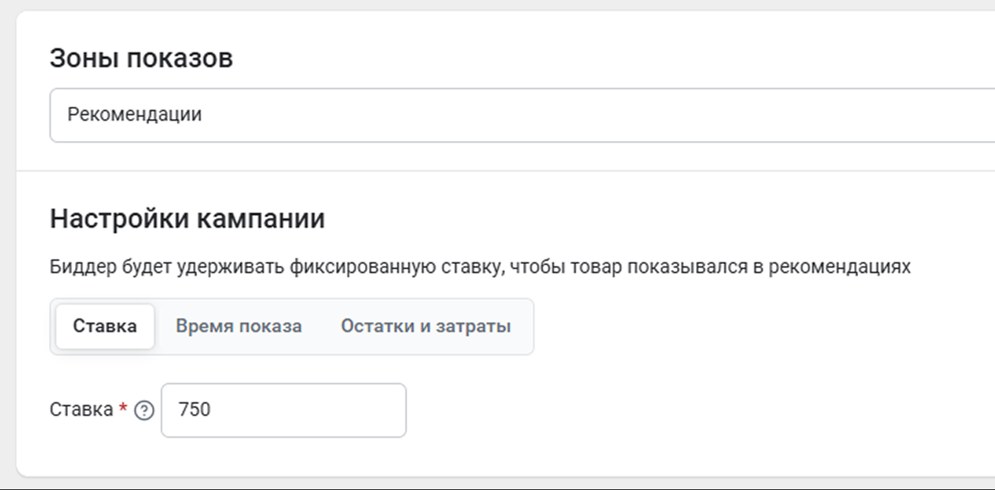 Для зоны показов в Рекомендациях биддер всегда применяет стратегию Удержание ставки. Нужно только указать размер ставки – инструмент будет ее удерживать, чтобы товар показывался в рекомендациях.