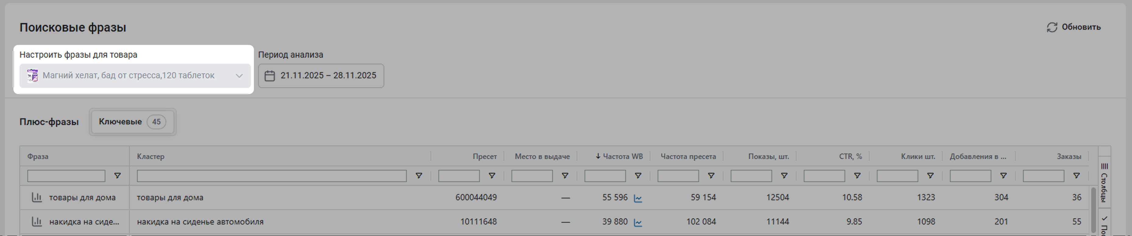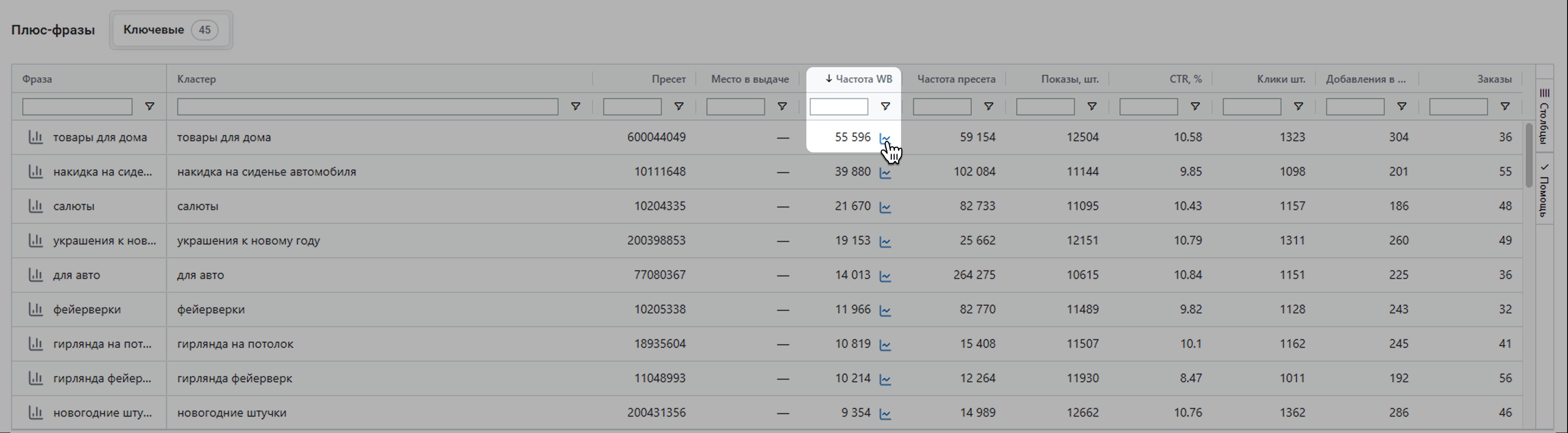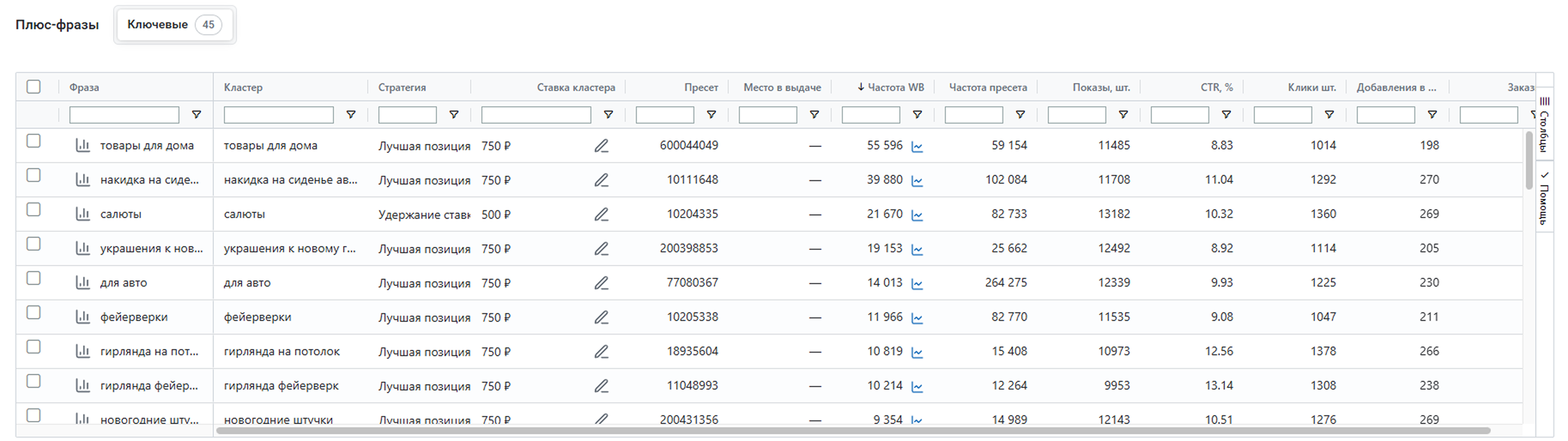Во вкладку Ключевые попадают фразы и кластеры, которые передает нам Wildberries.