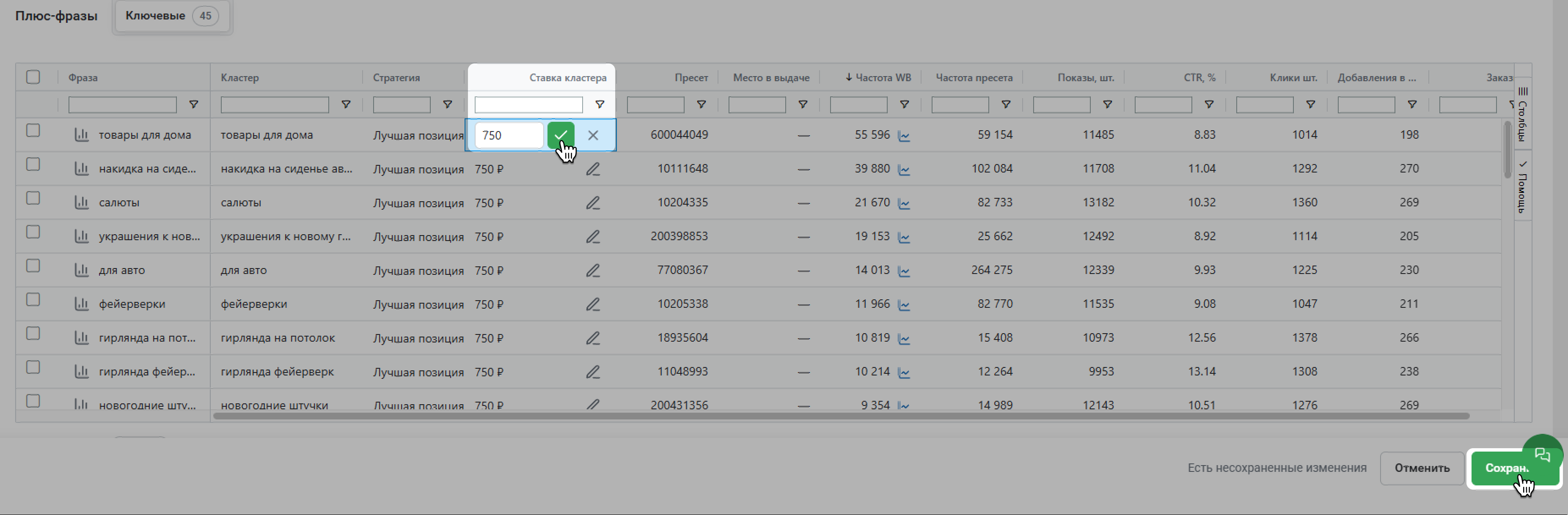 Вы можете задать особую ставку для 10 кластеров. Биддер будет продвигать товар по этим кластерам, удерживая указанную вами ставку вне зависимости от диапазона мест – как при стратегии Удержание ставки. В столбце Ставка кластера нажмите на карандаш и введите свою ставку. Нажмите на галочку, а затем – Сохранить.