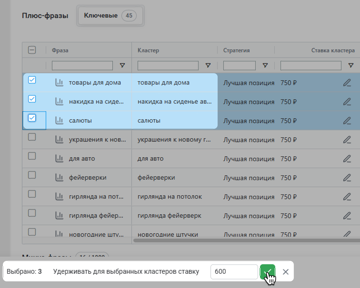 Можно задать общую ставку для нескольких кластеров. Для этого выделите кластеры галочками и в нижней части экрана укажите ставку. Нажмите на галочку, затем – Сохранить.