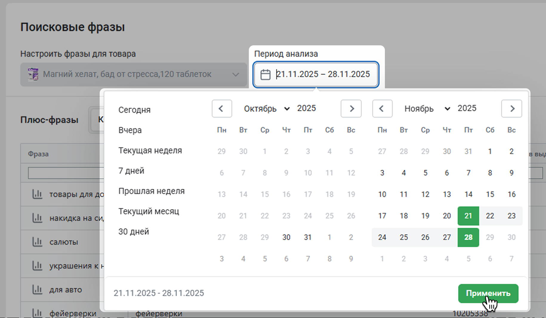 Вы можете указать желаемую частоту фразы. Впишите значение в поле и нажмите Применить – AI подберет фразы с этой частотой и выше.